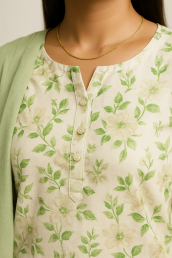 The kurta features an all-over floral print in soft shades of green on a cream base — airy, elegant, and naturally charming. A simple round neckline with a short button placket adds understated sophistication.