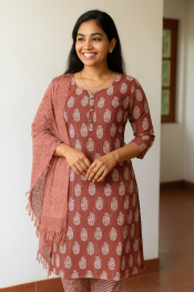 Experience comfort and traditional elegance with this 3-piece Cotton Printed Churidar Set. Designed with a beautiful block-inspired motif and breathable cotton fabric, this outfit is perfect for daily wear or festive occasions.