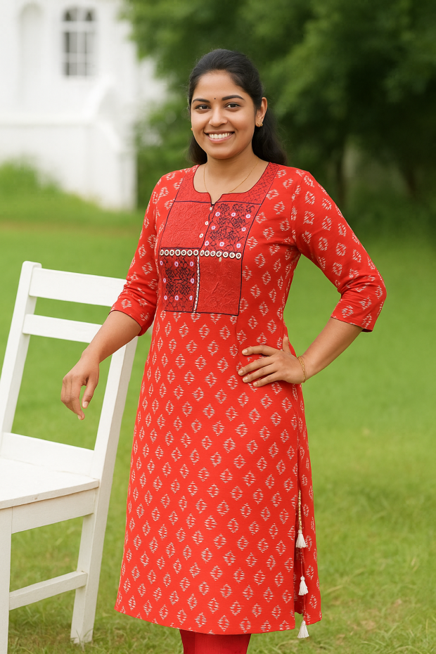 Bring home the charm of South Indian craftsmanship with the Aarvi Ikat Elegance Embroidered Cotton Kurta, designed for comfort, elegance, and everyday style.