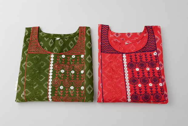 This kurta blends traditional ikat patterns with fine embroidery work, creating a graceful look suitable for both casual and festive occasions.