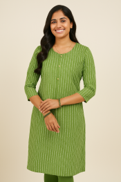 Made from a soft and breathable cotton-blend fabric, this kurta features a sleek vertical striped print that enhances your natural grace. The subtle golden buttons on the front placket add a refined touch, making it suitable for both office and casual settings.