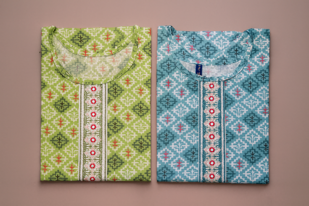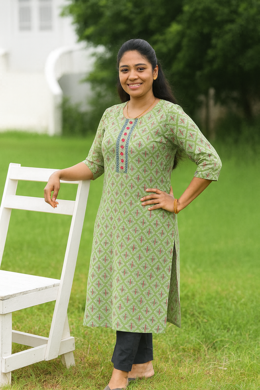 Available in two soothing pastel shades — soft Green and cool Sky Blue — each piece highlights intricate traditional patterns accented with charming red thread motifs. The straight-fit silhouette ensures all-day comfort, while the cotton fabric keeps you cool even in warm weather.