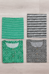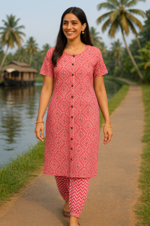 Fresh everyday 2-piece set with a printed front-button kurta and matching zig-zag pants. Soft, breathable fabric; easy fit for Kerala weather. Available in Emerald Green and Charcoal Black. Now ₹499 (MRP ₹799) on Absaara.