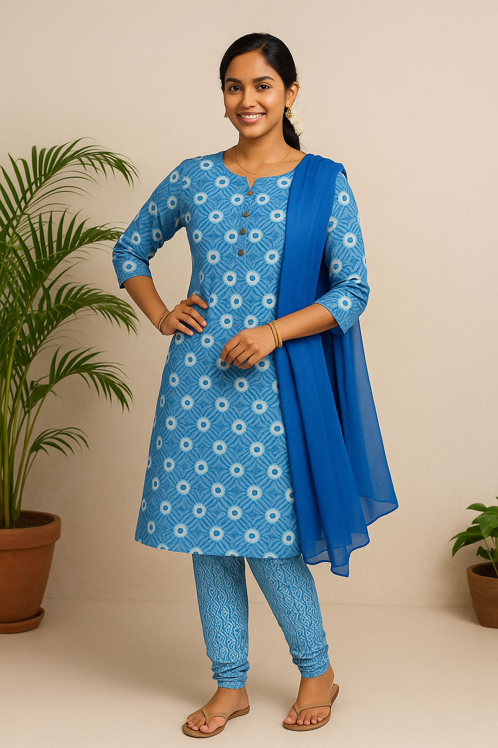 The matching cotton churidar bottom carries a subtle, coordinating print, balancing the design perfectly. Completing the set is a solid deep-blue chiffon dupatta that drapes gracefully, adding fluidity and elegance to the outfit. Lightweight and easy to style, this three-piece churidar set transitions seamlessly from office wear to casual outings and festive occasions.