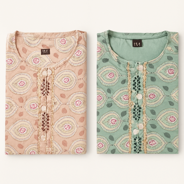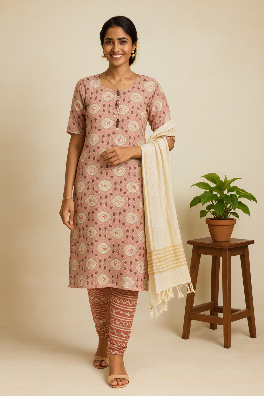 Available in two serene hues – Blush Rose Pink and Mint Green – both designed in the same charming pattern for versatile styling. Perfect for summer wear, festive gatherings, or office elegance, this cotton churidar set keeps you cool, comfortable, and effortlessly chic.