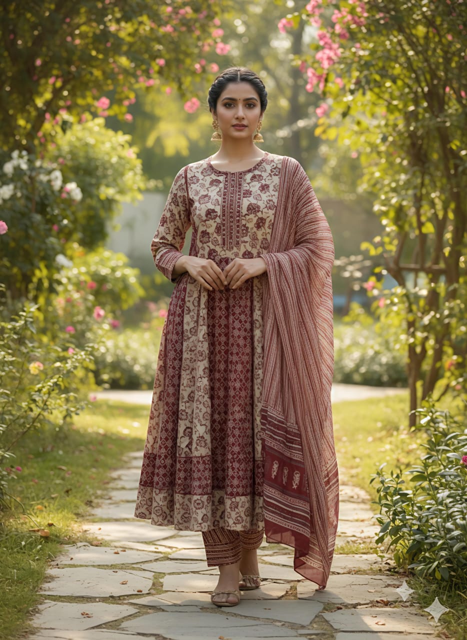 Step into effortless grace with this Erisha Jaipur Maroon Floral Flared Kurta Pant Dupatta Set, crafted from 100% pure cotton for unmatched comfort and elegance.