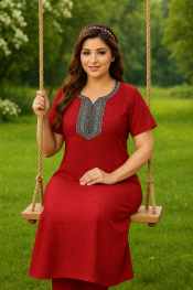 Stay stylish and comfortable with this soft cotton nighty featuring a beautifully embroidered neckline. Made from breathable cotton fabric for all-day comfort and elegance. Available in Teal, Wine Red, Royal Purple, and Black.