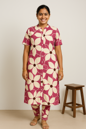 Refresh your ethnic collection with this Magenta & Ivory Floral Printed Rayon Churidar Set, a perfect blend of vibrant style and lightweight comfort. The kameez is crafted from premium rayon/viscose fabric, ensuring a smooth texture and fluid drape, while the cotton cambric churidar offers exceptional breathability and durability for daily wear. The eye-catching oversized floral print in magenta and ivory tones creates a bold yet elegant statement, making it ideal for both casual outings and semi-formal gatherings.