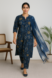 Embrace timeless elegance with the Midnight Bloom Rayon-Cotton Churidar Suit Set, featuring a floral-printed rayon top, cotton cambric pant, and soft cotton mulmul dupatta. A perfect blend of comfort and style. MRP ₹1,299 | Now at ₹799.