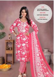 A lively three-piece set with a premium embroidered cotton kurta, a soft printed cotton churidar, and a matching printed dupatta — perfect for work, festive days, and casual outings.