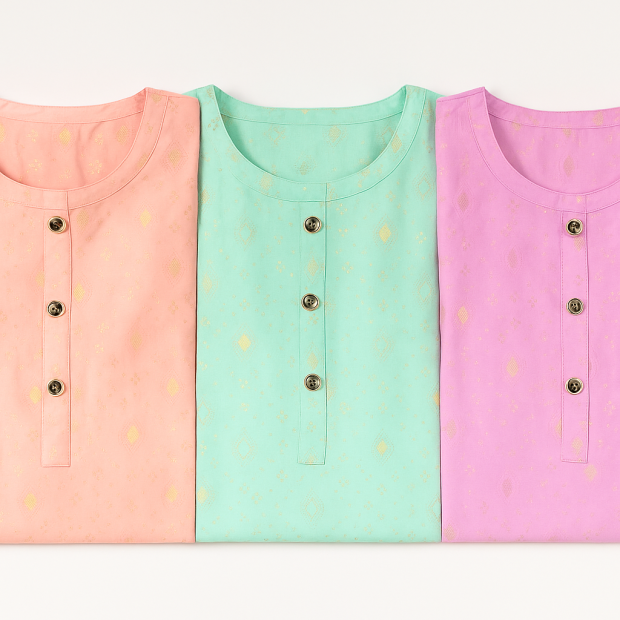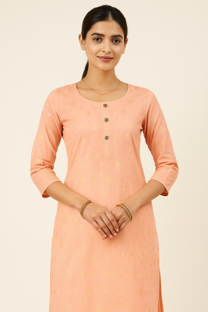 Crafted from premium soft cotton blend fabric, this kurti offers breathable comfort and delicate styling. The all-over gold motif print adds a festive sparkle while keeping the design lightweight and easy to wear. The round neckline with button detailing adds sophistication, making it suitable for both everyday wear and special occasions.