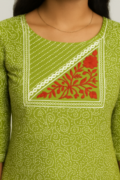 Pattern & Color: Olive green with white ikat dot print; embroidered triangular yoke with red floral thread work and lace trim.