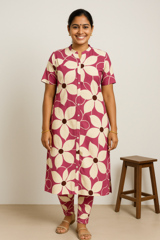 Magenta & Ivory Floral Printed Rayon Churidar Set