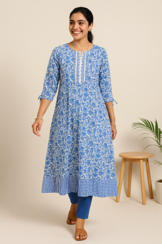 Blue Floral Printed Cotton Kurta with Gingham Hem Detail