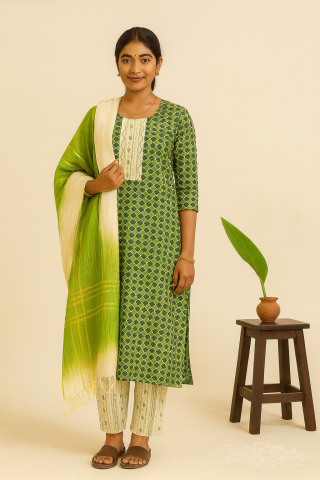 Mehreen Green Grace” Pure Cotton Printed Churidar Set with Handloom Dupatta