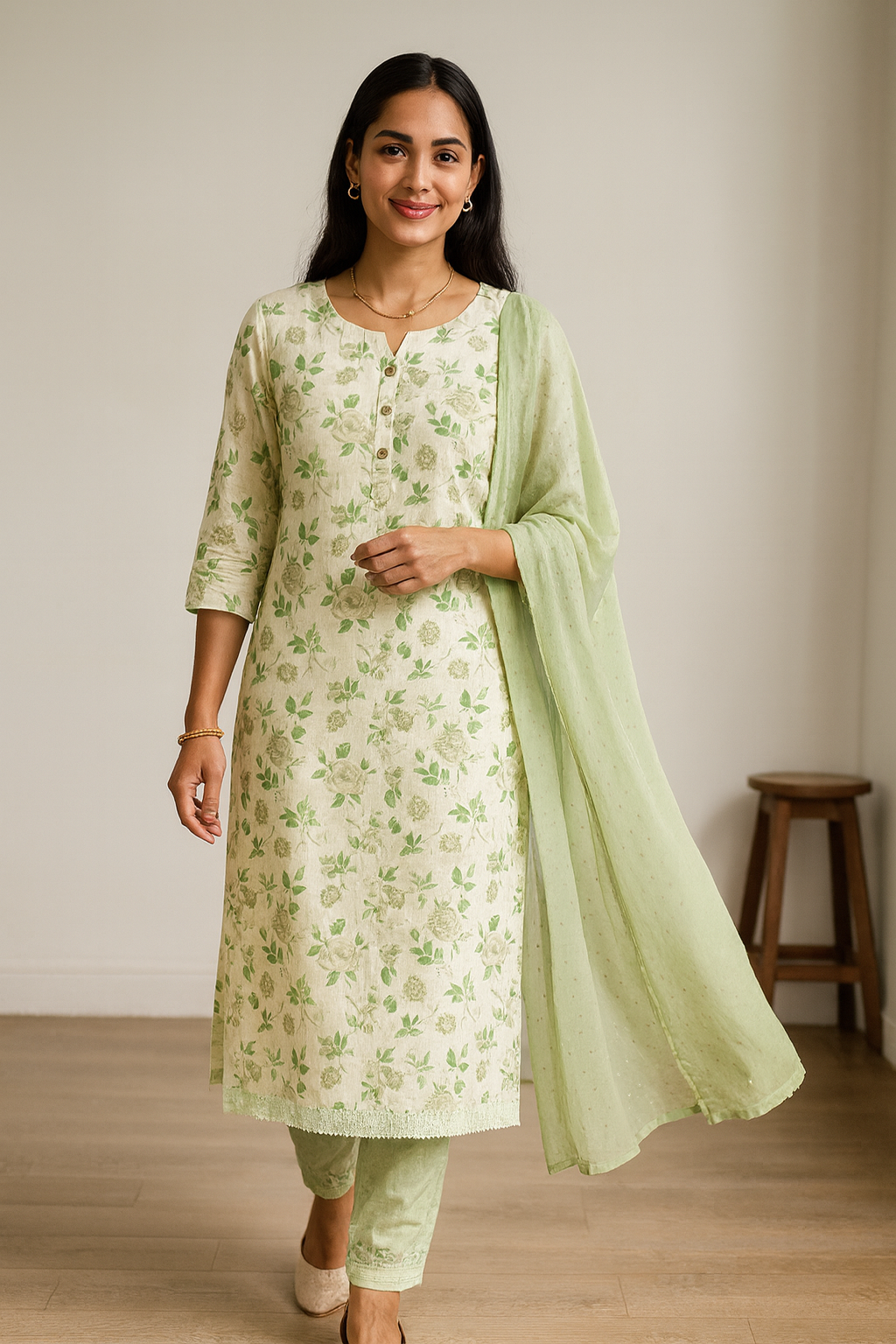 The kurta features an all-over floral print in soft shades of green on a cream base — airy, elegant, and naturally charming. A simple round neckline with a short button placket adds understated sophistication.