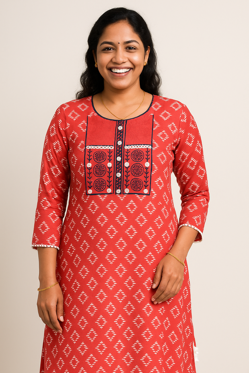 Bring home the charm of South Indian craftsmanship with the Aarvi Ikat Elegance Embroidered Cotton Kurta, designed for comfort, elegance, and everyday style.