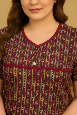 Soft and breathable 100% cotton nighty with elegant traditional prints and contrast piping. Designed for ultimate comfort and everyday style.