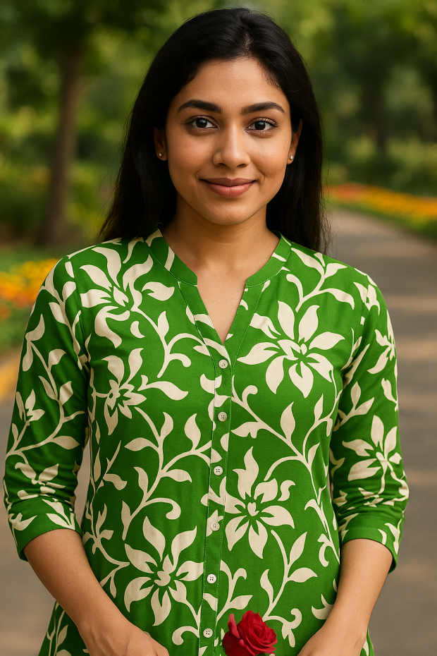 Step into everyday elegance with the Absaana Emerald Blossom Cotton Kurta Set. This beautiful set features a vibrant green floral printed kurta made from premium cambric cotton, paired with matching cotton pants for a coordinated look.
