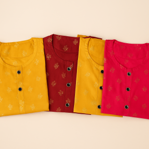 Featuring a gold floral foil print, this kurta blends simplicity with festive charm — perfect for daily wear, casual outings, or festive occasions.