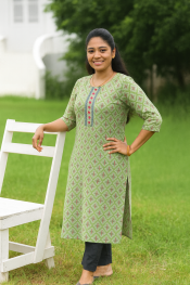Available in two soothing pastel shades — soft Green and cool Sky Blue — each piece highlights intricate traditional patterns accented with charming red thread motifs. The straight-fit silhouette ensures all-day comfort, while the cotton fabric keeps you cool even in warm weather.