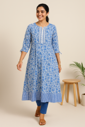Made from 100% premium cotton, the kurta is lightweight, soft on the skin, and breathable — ideal for India’s warm and humid climate. The fresh blue-and-white floral print adds a touch of sophistication, while the intricate vertical pintuck-inspired yoke design draws the eye and gives the silhouette a flattering, elongated look.