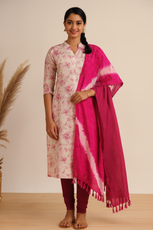 The Blush Petal Cotton Churidar Set brings together breathable comfort and timeless Indian elegance. This three-piece women’s suit set features a graceful off-white cotton cambric kurta adorned with delicate pink floral prints — lightweight, soft, and ideal for all-day wear. The kurta’s V-neckline with a neat mandarin collar and front placket offers a smart, flattering look suited for both casual and office settings.