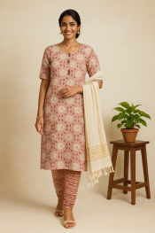 Kameez/Top: Soft cotton fabric with intricate floral and leaf-inspired block prints in soothing blush rose tones, enhanced by delicate mirror-style lace detailing on the neckline and front panel for a refined look.