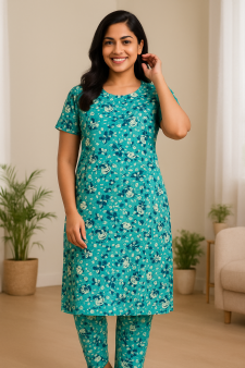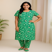 Elevate your daily style with this 100% cotton green kurti showcasing a lively all-over floral print in cream and dark green. The design includes a round neckline with front slit, elbow-length sleeves, and a straight relaxed fit, making it soft, breathable, and perfect for all-day comfort. Team it with leggings or churidar for an easy, elegant everyday look.