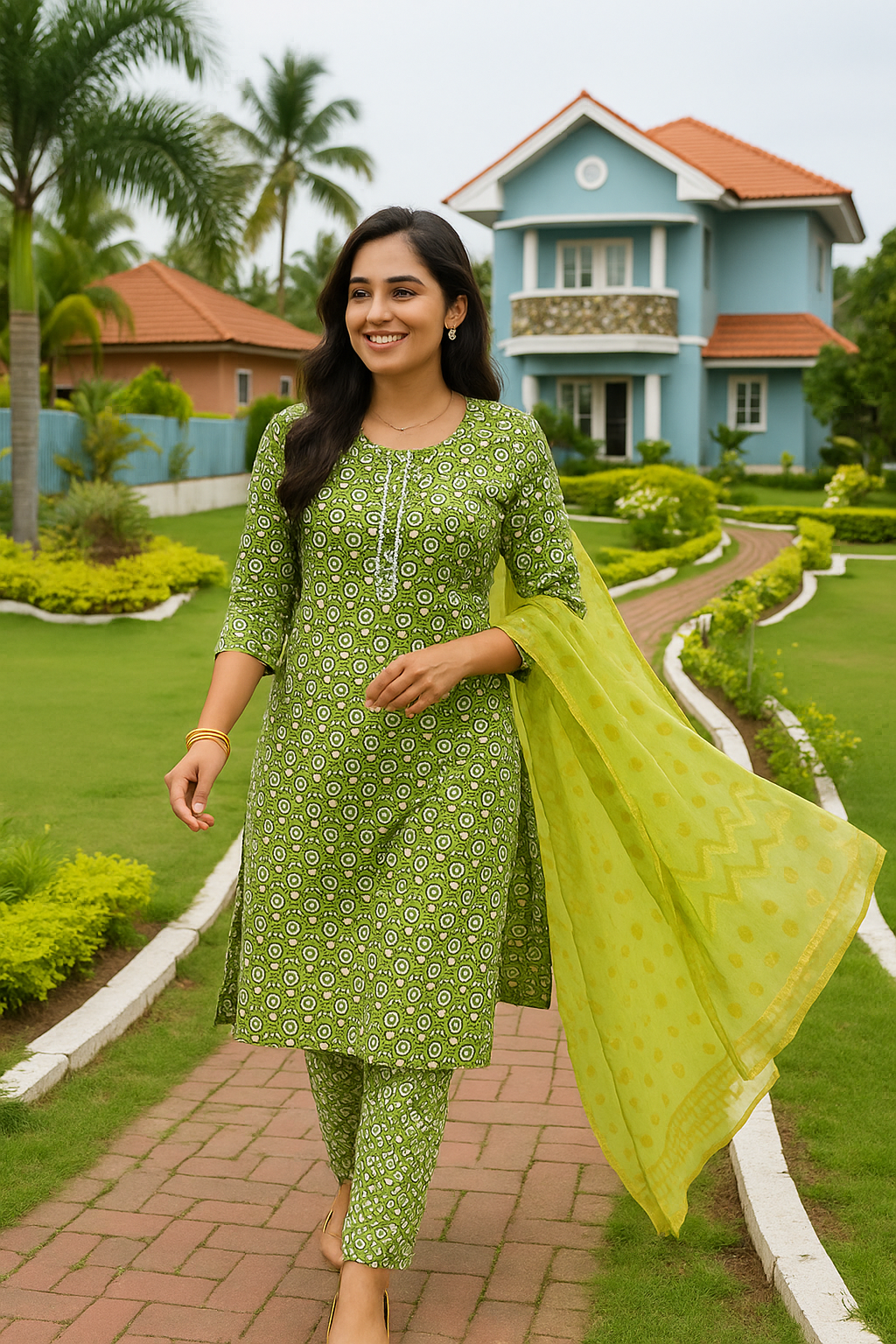 Grace Bloom – Green Printed Cotton Churidar Set with Tie-Dye Dupatta