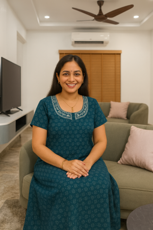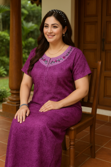 Elegant embroidered cotton nighty featuring soft breathable fabric, beautiful white vine-leaf embroidery on the neckline, and a relaxed fit for all-day comfort.