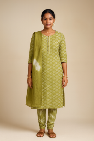 Step into freshness with the Lime Blossom Cotton Churidar Set, crafted in soft Cotton Cambric for breathable comfort. The lime-green floral-printed kameez, striped churidar, and tie-dye cotton-chiffon dupatta make it perfect for summer wear, office elegance, or festive simplicity.