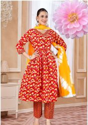 Minu Fashion PANKHURI – Red & Yellow Printed Cotton Anarkali Suit with Tie-Dye Dupatta (XL)