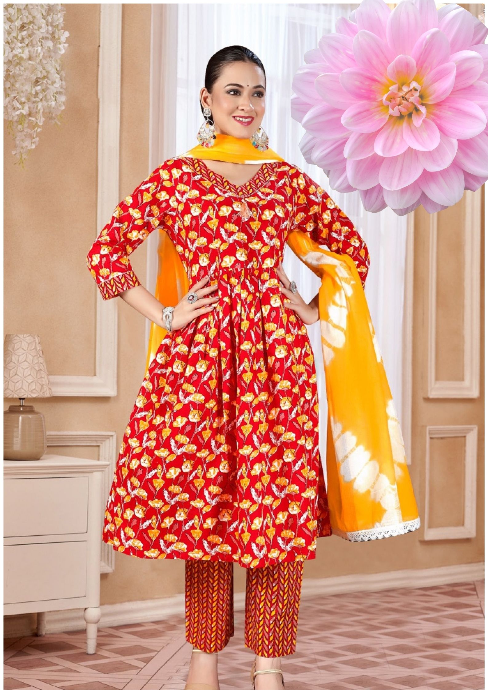 Minu Fashion PANKHURI – Red & Yellow Floral Anarkali Cotton Suit with Tie-Dye Dupatta (XL)