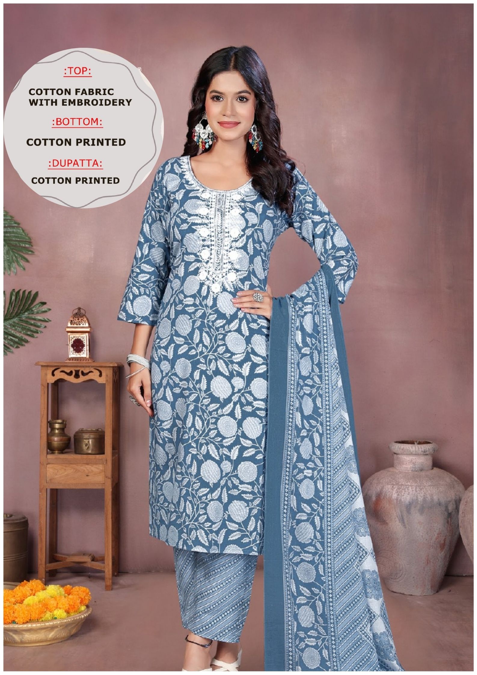 Dupatta: Coordinated printed cotton dupatta, lightweight and easy to drape, adding a polished touch to the look.