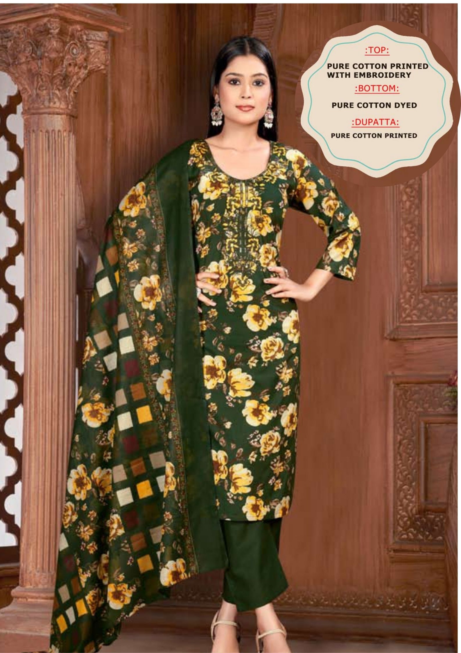 Minu Majestic – Forest Green Floral Cotton Churidar Set with Embroidery (XL)