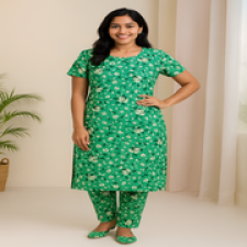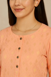 Crafted from premium soft cotton blend fabric, this kurti offers breathable comfort and delicate styling. The all-over gold motif print adds a festive sparkle while keeping the design lightweight and easy to wear. The round neckline with button detailing adds sophistication, making it suitable for both everyday wear and special occasions.