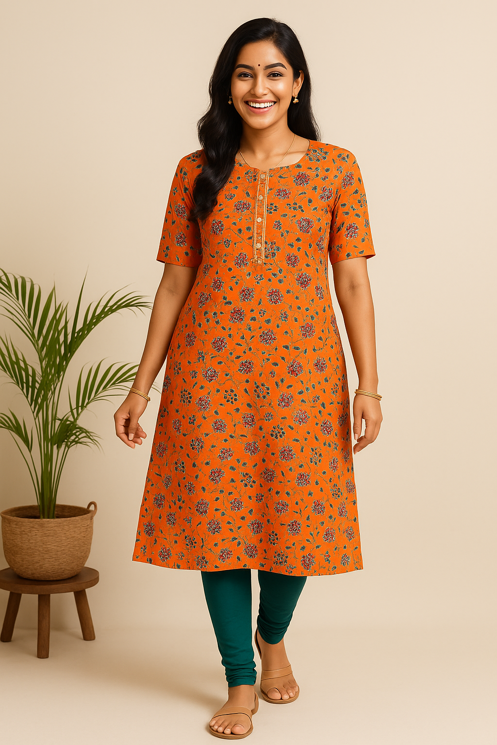 Sunlit Blossom Cotton Churidar Top – Orange Floral Elegance