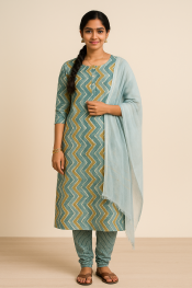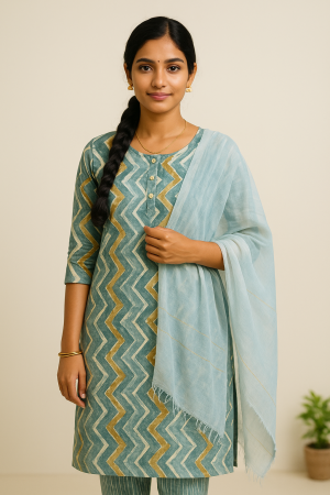 This stylish Teal & Mustard Chevron Cotton Churidar Set is crafted with comfort in mind — the kameez and churidar are 100% cotton and paired with a sheer chiffon dupatta for an airy finish. The straight, relaxed-fit kameez features an all-over chevron (zigzag) brush-stroke print in teal, white and warm mustard, a neat round neckline and a smart front button placket for easy styling. The coordinating cotton churidar/pant shows fine vertical stripes for a tasteful contrast and a comfortable slim fit. A translucent sky-blue chiffon dupatta with subtle horizontal accents drapes effortlessly and adds feminine movement. Cotton’s natural breathability and durability make this ethnic wear ideal for hot days, regular office use or casual and festive occasions — soft on skin, easy to care for and long-lasting. This three-piece women’s suit set includes top, pant and dupatta. MRP ₹1,299 — available now at a special price of ₹799. SEO keywords: cotton churidar set, ethnic wear, traditional outfit, women’s suit set, summer wear, breathable fabric.