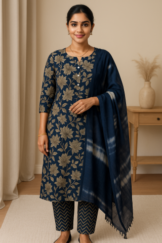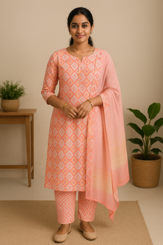 Blush Petal Cotton Churidar Set – 3-Piece Floral Elegance for Effortless Everyday Style