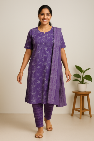 Purple Blossom Cotton Churidar Set with Printed Kurta & Soft Mulmul Dupatta
